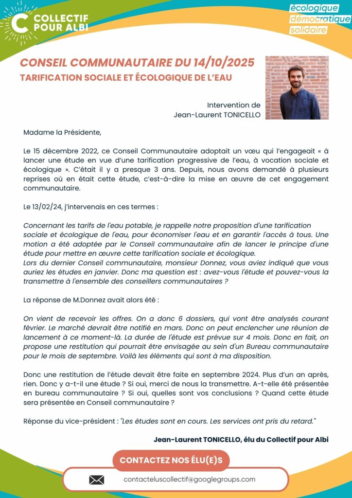 Le 15 décembre 2022, ce Conseil Communautaire adoptait un vœu qui l’engageait « à lancer une étude en vue d’une tarification progressive de l’eau, à vocation sociale et écologique ». C’était il y a presque 3 ans. Depuis, nous avons demandé à plusieurs reprises où en était cette étude, c’est-à-dire la mise en œuvre de cet engagement communautaire.